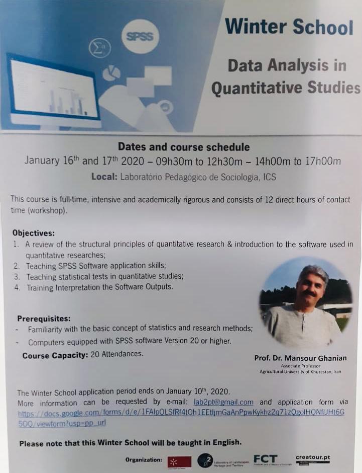 به گزارش روابط عمومی، کارگاه دو روزه با عنوان تحلیل داده ها در مطالعات کمی، ویژه دانشجویان پسا دکترا و اعضا هیات علمی، توسط آقای دکتر منصور غنیان در دانشکده علوم انسانی دانشگاه مینهو، شهر براگا پرتغال در تاریخ ۱۶ و ۱۷ ژانویه ۲۰۲۰ برگزار می گردد.