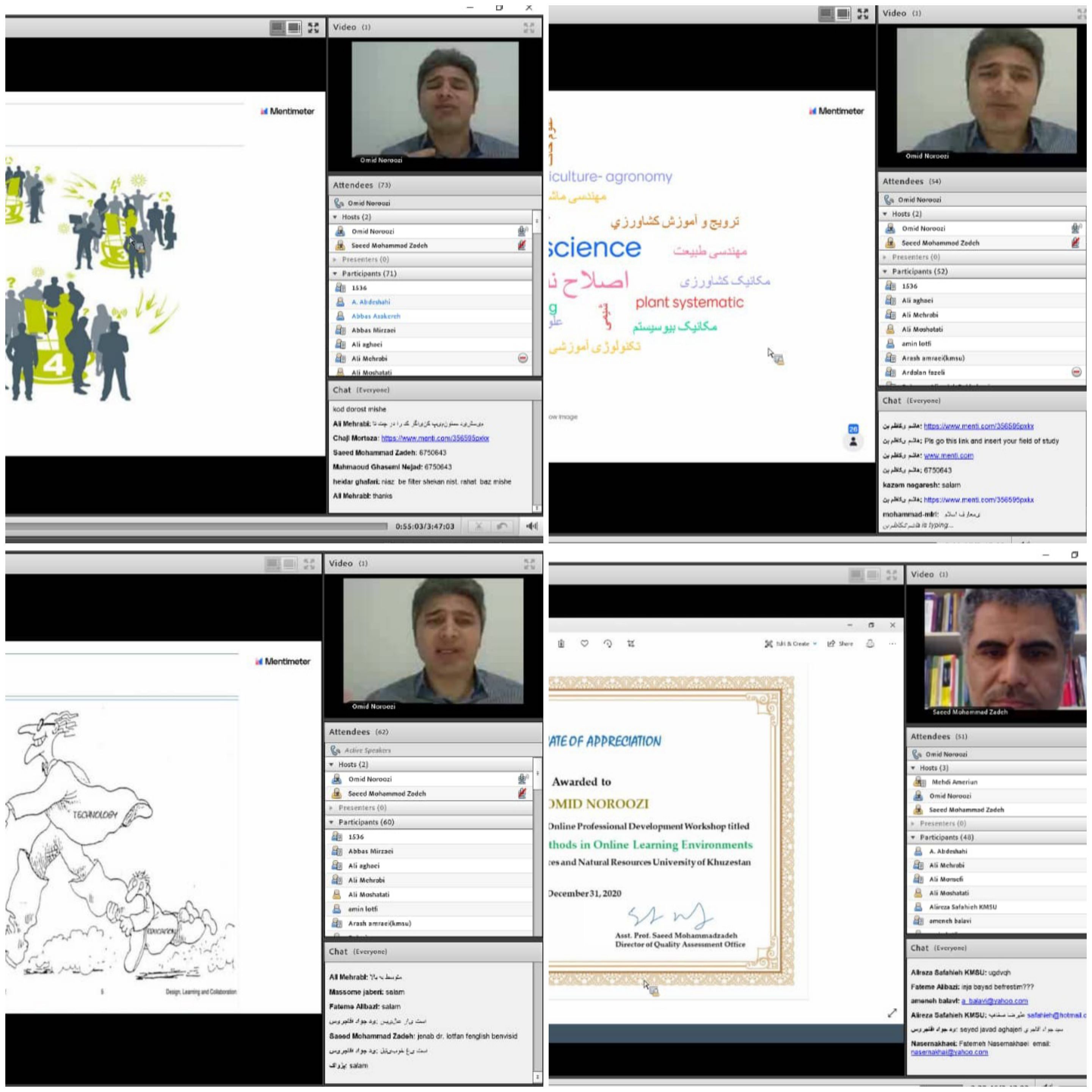 در انتهای جلسه جناب آقای دکتر عبدشاهی رئیس محترم دانشگاه، با اشاره به ضعف قبلی زیرساخت دانشگاه در حوزه آموزش مجازی، شیوع ویروس کرونا را فرصتی برای توسعه زیرساختهای دانشگاه در این حوزه قلمداد نمودند. ایشان پیشبرد آموزش مجازی در نیم سال قبل علیرغم فقدان زیرساخت قبلی را مرهون توانمندی اعضای هیئت علمی این دانشگاه دانستند. رئیس دانشگاه ضمن تشکر از دکتر نوروزی بخاطر اهمیت مطالب تدریس شده در کارگاه و تحسین شیوه تدریس مشارکتی و جذاب ایشان به مثابه یک کلاس درس مشارکتی برای شرکتکنندگان، لوح تقدیر ایشان را اعطاء نمودهاند.