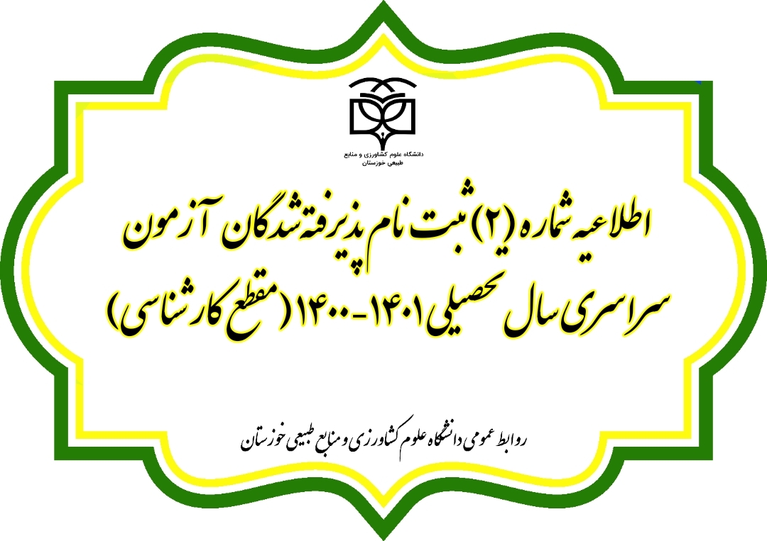 اطلاعیه شماره (۲) ثبتنام پذیرفتهشدگان آزمون سراسری سال تحصیلی ۱۴۰۱-۱۴۰۰ (مقطع کارشناسی)