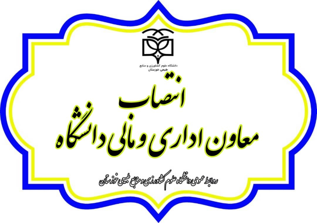 احتراماً، به استناد ماده 5 آئیننامه جامع مدیریت دانشگاهها و مؤسسات آموزش عالی "موضوع بخشنامه شماره 90/1521/دش مصوب جلسه 684 مورخ 12/10/ 89 شورای عالی انقلاب فرهنگی" و نظر به مراتب تعهد، دانش و تجارب جنابعالی، به موجب این ابلاغ و با حفظ سمت آموزشی و پژوهشی، به مدت دو سال به سمت معاون اداری و مالی دانشگاه علوم کشاورزی و منابع طبیعی خوزستان، منصوب میشوید. امید است در راستای تحقق اقتصاد مقاومتی با نظارت بر حسن اجرا و صیانت از نیروی کار و همچنین ارتقاء روابط انسانی-اخلاقی در جهت تحقق عدالت و ایجاد تفاهم و محبت هر چه بیشتر بین اساتید، کارشناسان و همکاران متعهد حوزههای مختلف دانشگاه، موفق و پیروز باشید. توفیق روز افزون حضرتعالی را از خداوند سبحان مسئلت مینمایم.