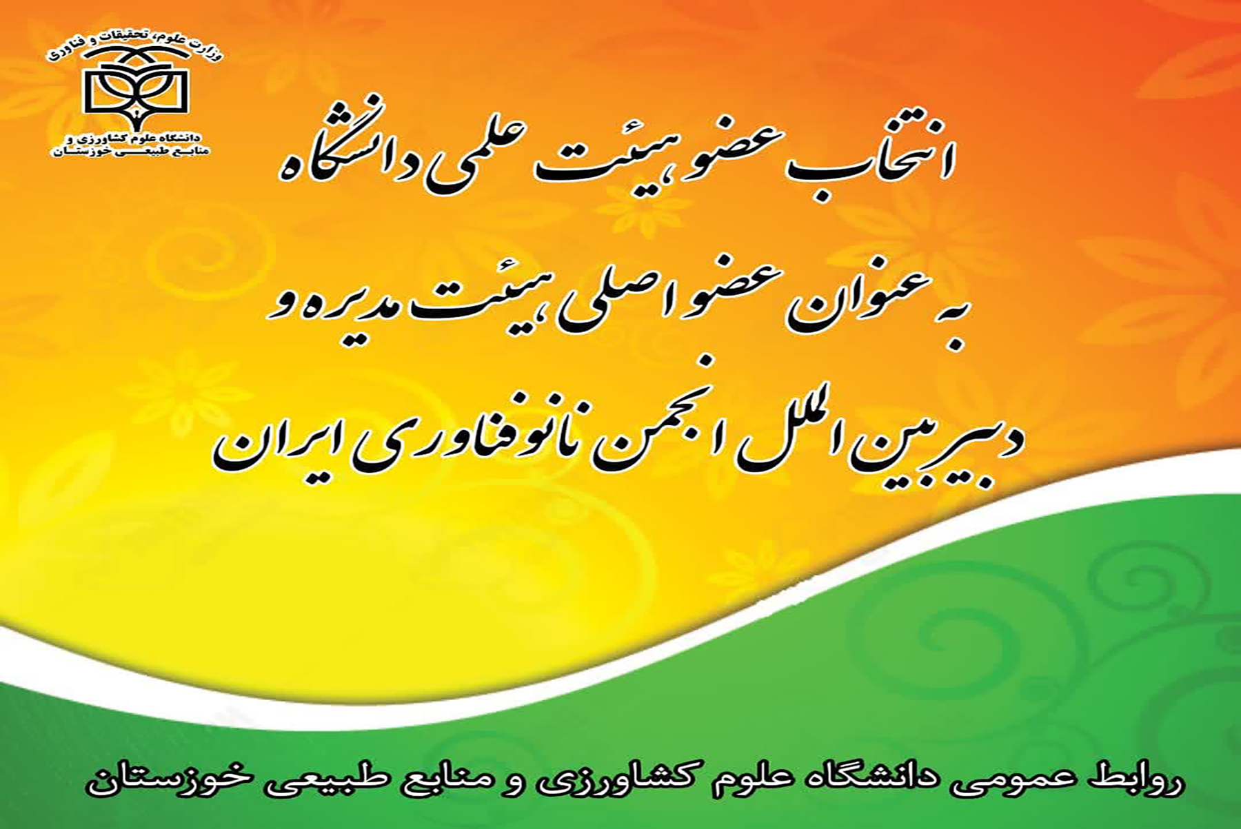 به گزارش روابط عمومی دانشگاه، در برگزاری انتخابات انجمن نانوفناوری ایران دکتر محمد گلباشی عضو هیئت علمی گروه مهندسی تولید و ژنتیک گیاهی دانشگاه علوم کشاورزی و منابع طبیعی خوزستان به عنوان عضو اصلی هیئت مدیره و دبیر بینالملل این انجمن انتخاب شد.