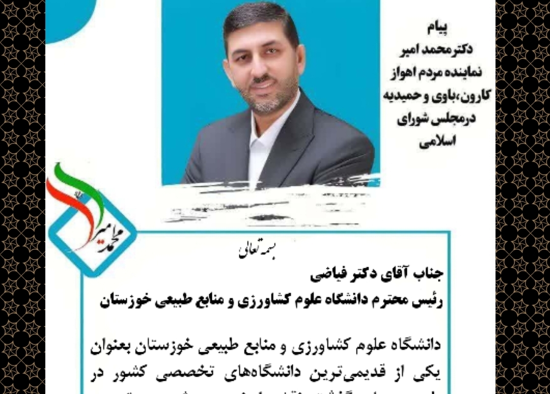 به گزارش روابط عمومی، دکتر محمد امیر نمایندهی مردم اهواز، کارون، باوی و حمیدیه در مجلس شورای اسلامی در پی درخشش معاونت فرهنگی و اجتماعی دانشگاه علوم کشاورزی و منابع طبیعی خوزستان در سطح کشور، پیام تبریکی صادر کرد. متن این پیام به شرح ذیل است: