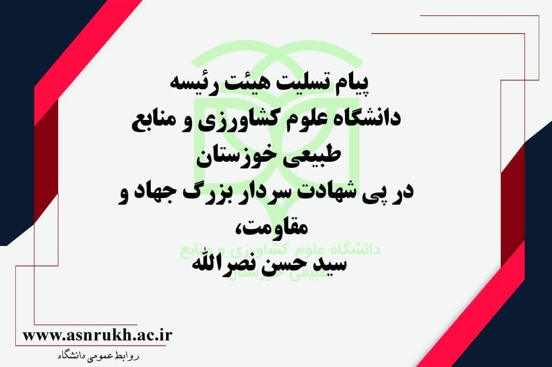 پیام تسلیت هیئت رئیسه دانشگاه علوم کشاورزی و منابع طبیعی خوزستان در پی شهادت سردار بزرگ جهاد و مقاومت، سید حسن نصرالله