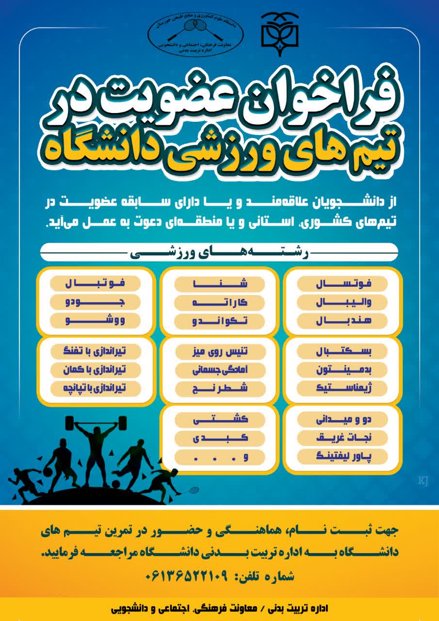 فراخوان ثبتنام و عضویت در تیمهای ورزشی دانشگاه ۱۴ مهر ۱۴۰۴ | ۰۹:۳۲ کد : ۶۷۰۸ اطلاعیهها فرهنگی و دانشجویی