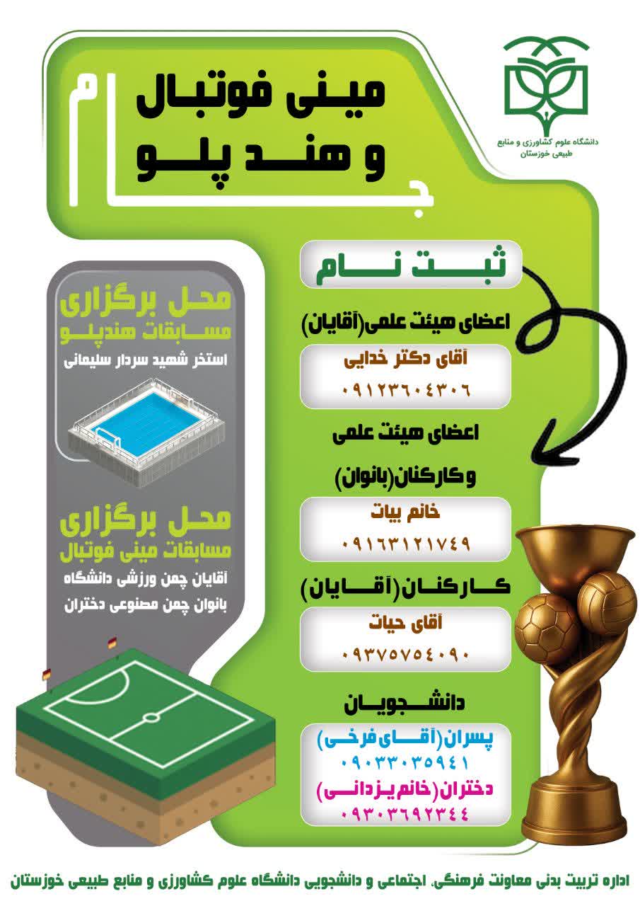 ثبتنام جام مینی فوتبال و هندپلو دانشگاهیان ۰۵ آبان ۱۴۰۴ | ۱۳:۱۱ کد : ۶۷۷۸ اطلاعیهها عمومی فرهنگی و دانشجویی