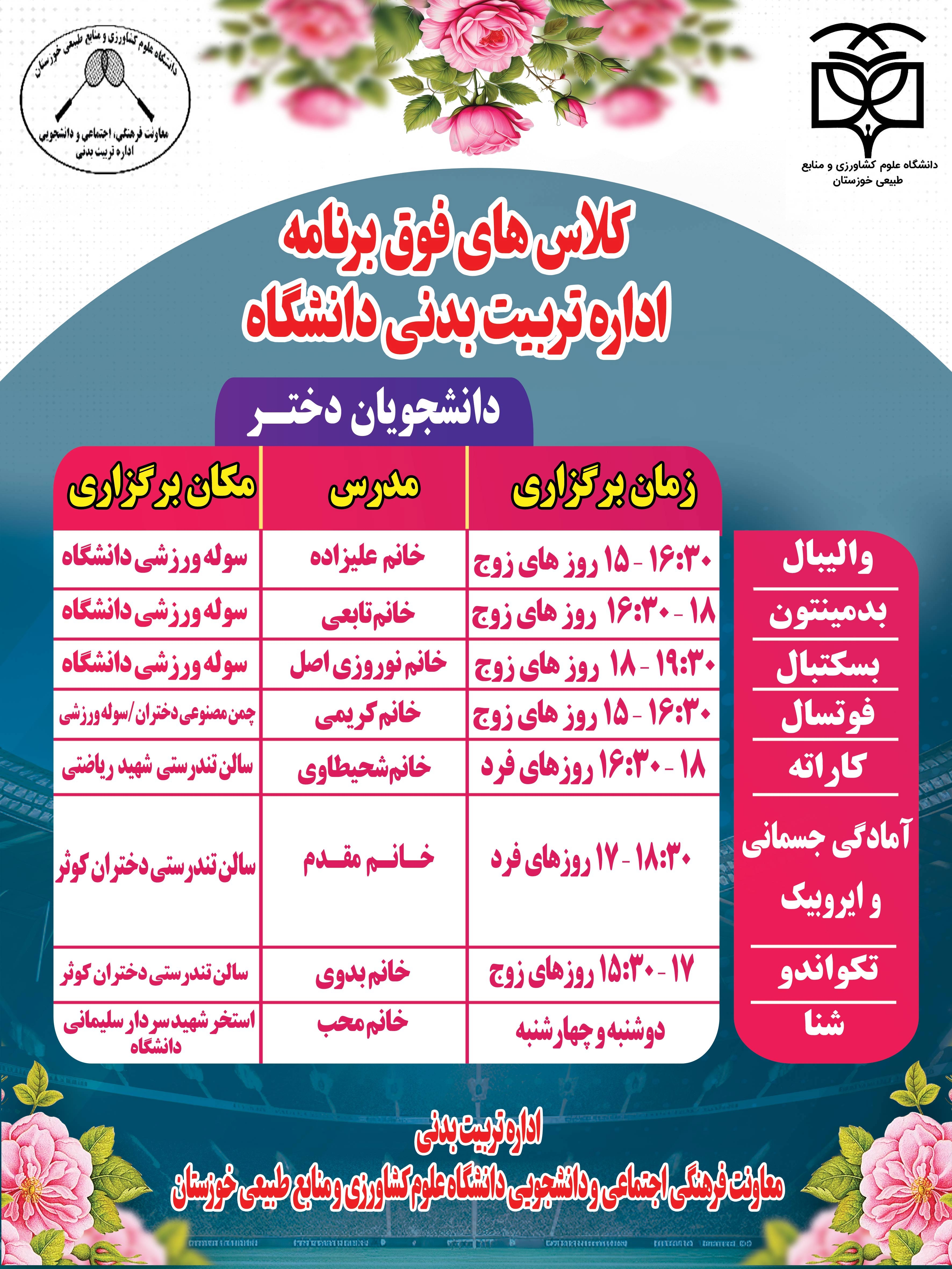 زمانبندی کلاسهای فوقبرنامه ورزشی دانشجویان دختر ۲۰ آبان ۱۴۰۴ | ۱۲:۰۳ کد : ۶۸۰۰ اطلاعیهها فرهنگی و دانشجویی