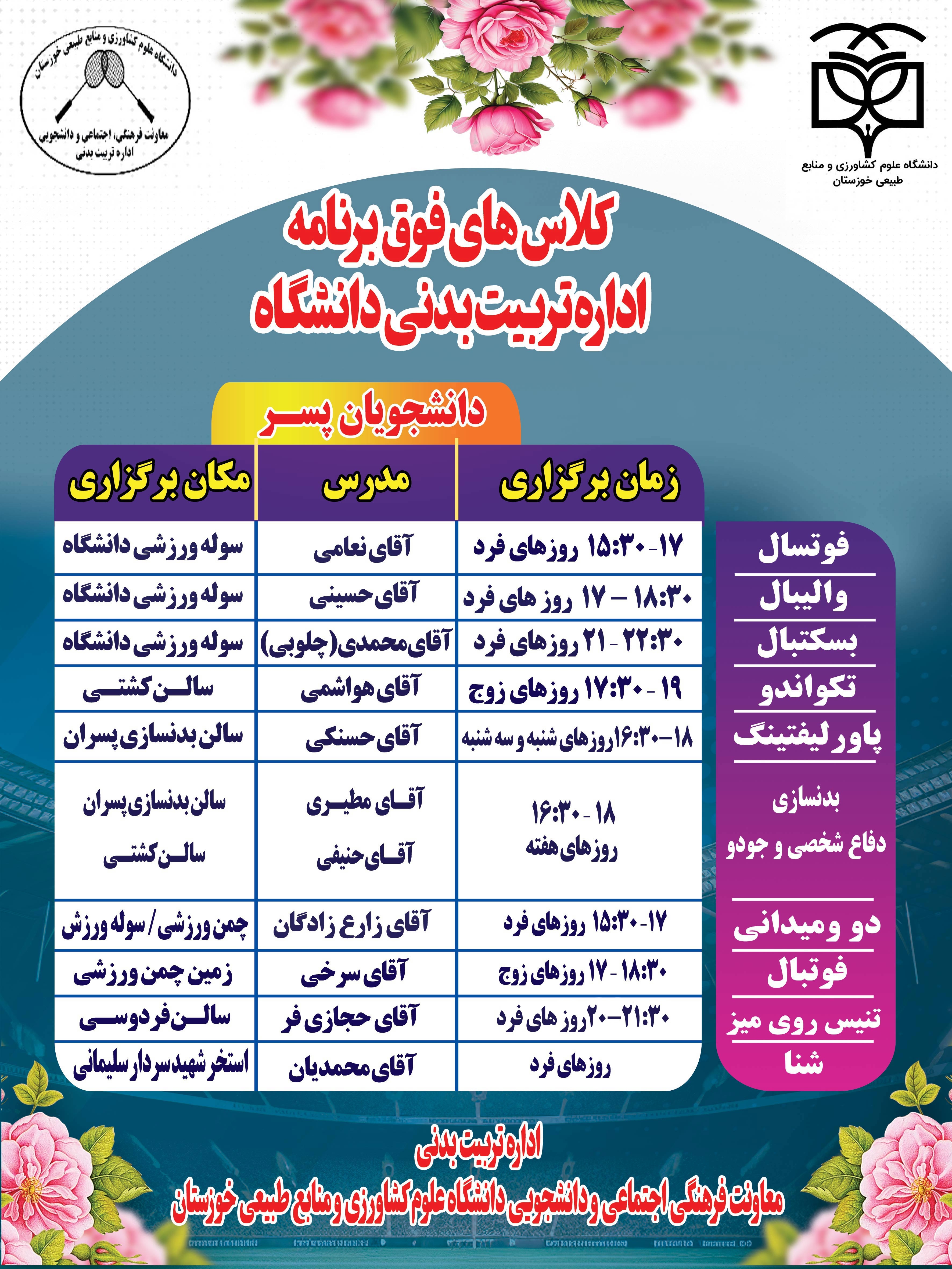 زمانبندی کلاسهای فوقبرنامه ورزشی دانشجویان پسر ۲۰ آبان ۱۴۰۴ | ۱۲:۰۴ کد : ۶۸۰۱ اطلاعیهها فرهنگی و دانشجویی