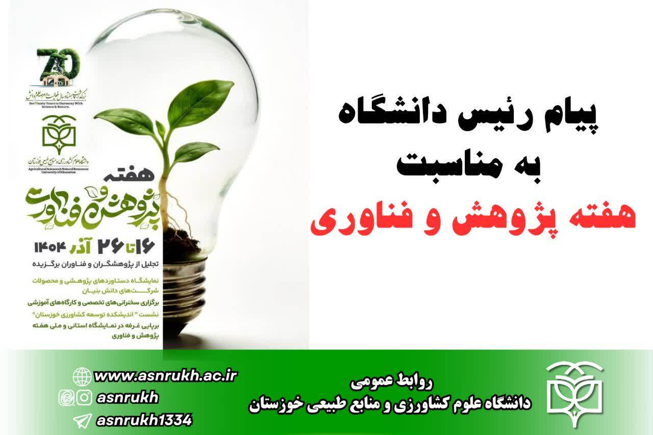 بدینوسیله آغاز هفته پژوهش و فناوری را به همه استادان، پژوهشگران و دانشجویان فرهیخته تبریک میگویم؛ ایامی که یادآور شکوفایی اندیشه و بالندگی علم است. بدون تردید پژوهش، نه تنها راهی برای کشف حقیقت، بلکه سفری است به ژرفای اندیشه و افقی تازه برای زندگی بهتر. هفته پژوهش و فناوری فرصتی است تا دانشگاه را نه صرفاً کلاس و کتابخانه، بلکه کانونی برای رویش اندیشههای نو بدانیم؛ جایی که بذر علم در خاک تجربه کاشته میشود و ثمرهاش به بار جامعه مینشیند. دانشگاه علوم کشاورزی و منابع طبیعی خوزستان، که امسال هفتاد سالگی خود را جشن میگیرد، با تکیه بر همت استادان و دانشجویان فرهیخته، میکوشد پژوهش را از حصار مقاله و آزمایشگاه بیرون آورد و به عرصه زندگی مردم پیوند زند؛ چرا که پژوهش اگر در خدمت زمین، آب، نان و آینده انسان نباشد، تنها واژهای بیجان خواهد بود. این هفت دهه تلاش و پویایی، سرمایهای گرانبهاست که امروز در دستان نسل جوان قرار دارد تا مسیر آینده را روشنتر سازد.