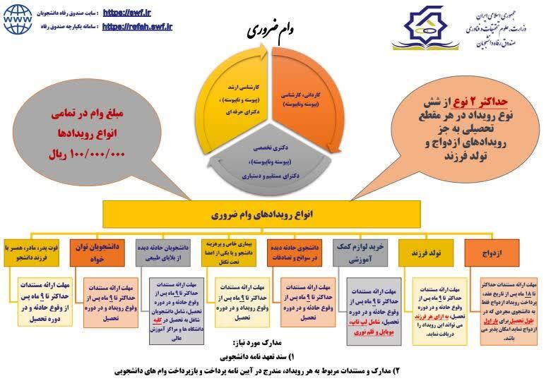 تمام اطلاعات مربوط به انواع وام ضروری و مدارک لازم، مطابق با آییننامه پرداخت و بازپرداخت، در پوستر گرافیکی درج شده است.