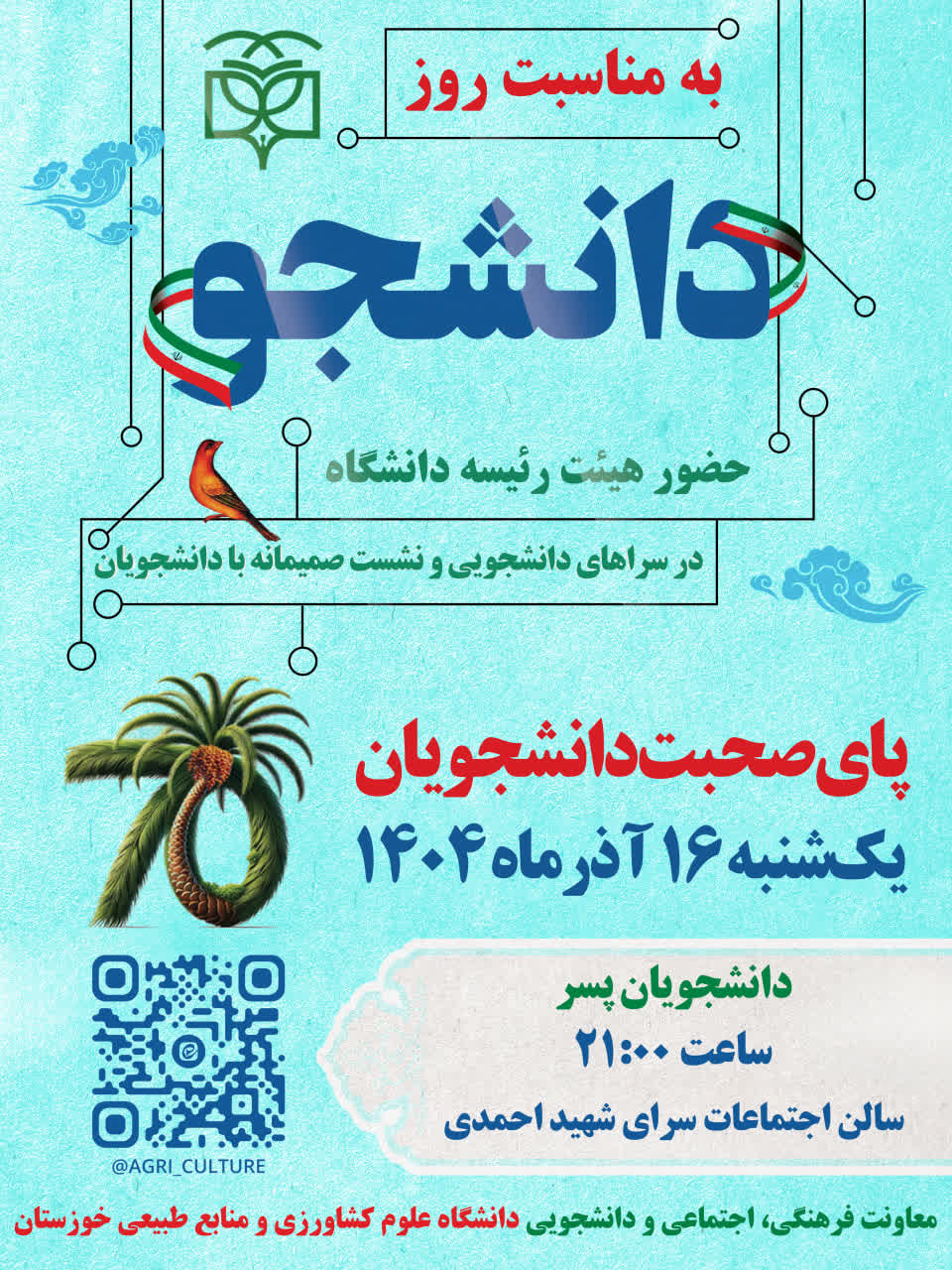 حضور هیئت رئیسه دانشگاه در سراهای دانشجویی و نشست صمیمانه با دانشجویان ۱۶ آذر ۱۴۰۴ | ۱۵:۳۰ کد : ۶۸۵۶ اطلاعیهها فرهنگی و دانشجویی