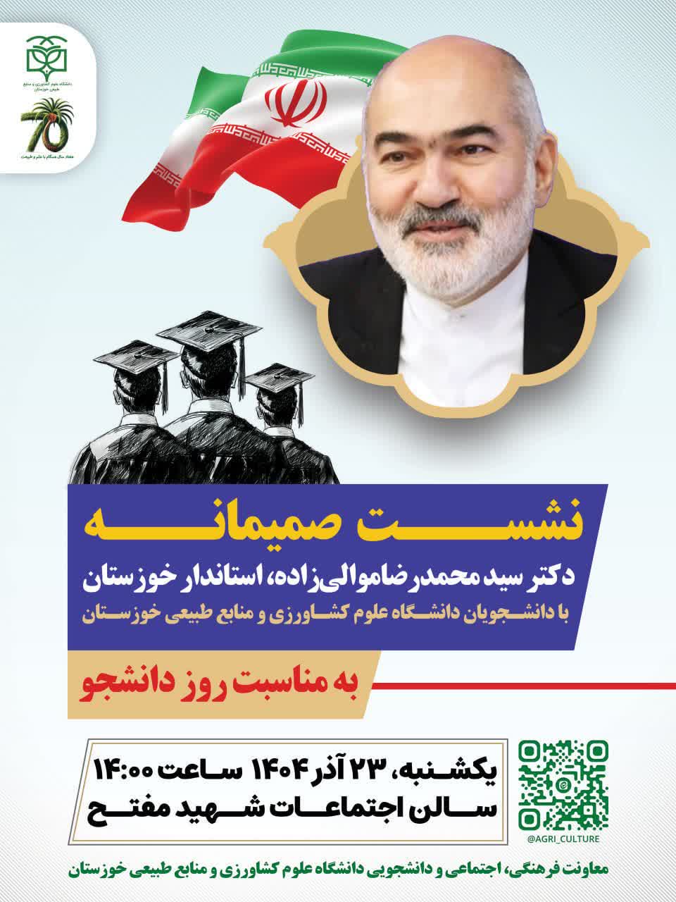 نشست صمیمانه دکتر موالیزاده، استاندار خوزستان، با دانشجویان دانشگاه علوم کشاورزی و منابع طبیعی خوزستان ۲۳ آذر ۱۴۰۴ | ۰۸:۱۶ کد : ۶۸۷۰ اطلاعیهها فرهنگی و دانشجویی