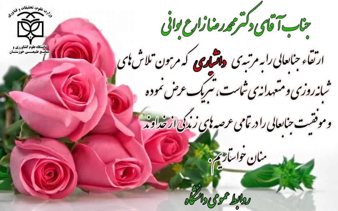 ارتقا مرتبه علمی دکتر محمدرضا زارع بوانی ۱۹ اردیبهشت ۱۴۰۳ | ۰۹:۳۲ کد : ۵۹۶۸ اخبار گروه تعداد بازدید:۳۶۳