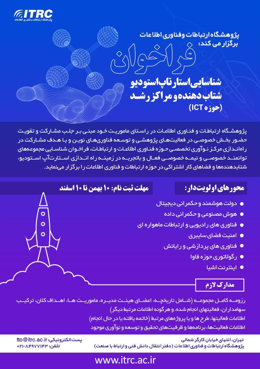 فراخوان شناسایی استارتاپ شتاب دهنده و مراک رشد حوزه ICT ۱۹ بهمن ۱۴۰۱ | ۱۰:۰۲ کد : ۴۷۱۷ اطلاعیه تعداد بازدید:۸۷۱