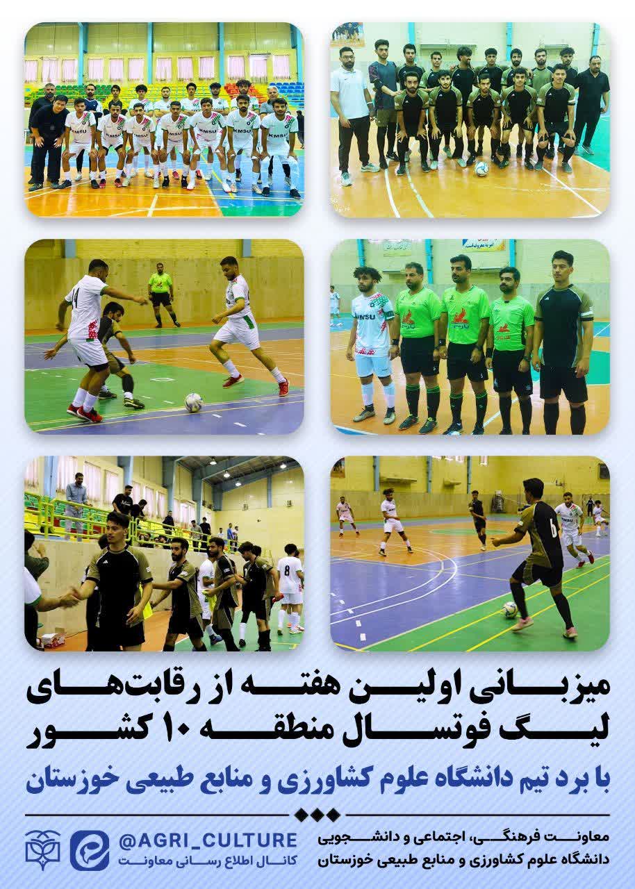 به گزارش روابط عمومی، در نخستین روز رقابتهای لیگ فوتسال دانشجویان پسر منطقه ۱۰ کشور که به میزبانی دانشگاه علوم کشاورزی و منابع طبیعی خوزستان برگزار شد، تیم فوتسال پسران دانشگاه با نمایشی پرانرژی و تهاجمی توانست با نتیجه درخشان ۵–۰ برابر تیم دانشگاه علوم و فنون دریایی خرمشهر به پیروزی قاطع دست یابد.